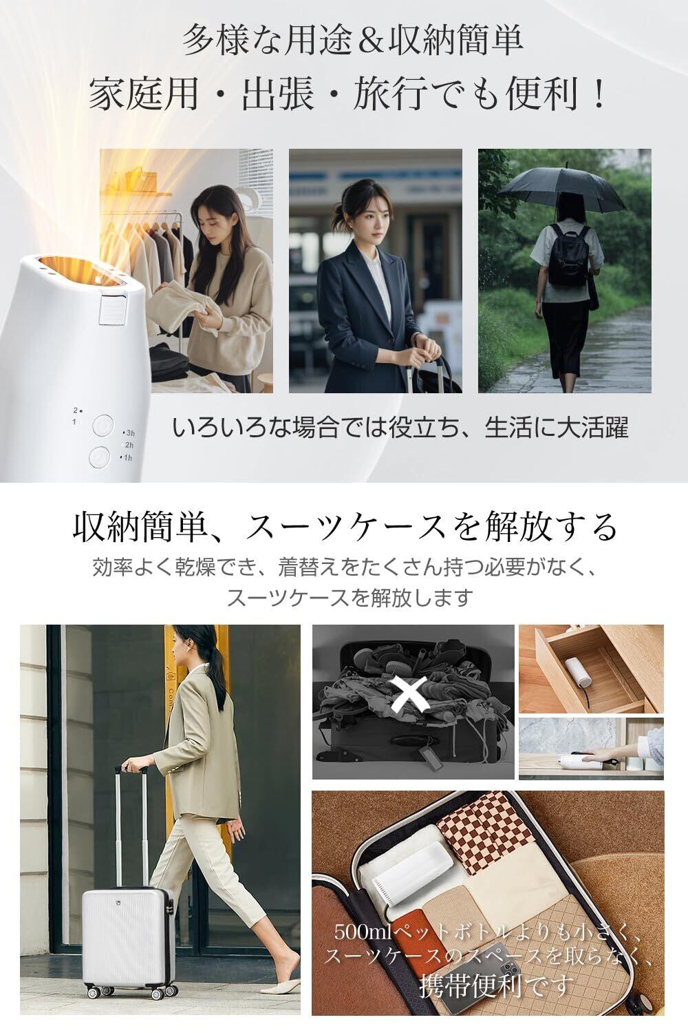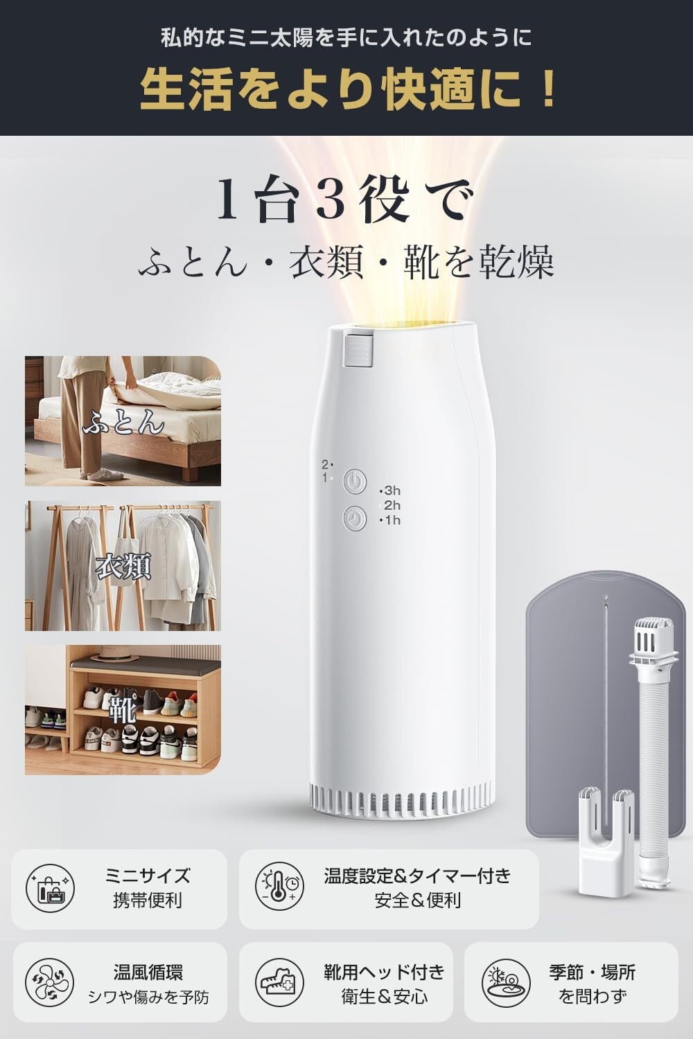 布団乾燥機 ふとん乾燥機 温風機能 調節可能 衣類乾燥 靴乾燥 布団乾燥 除湿 消臭 寒さ対策 静音設計 ダニ対策 梅雨対策 軽量/持ち運び/収納便利日本語取扱説明書付き (ホワイト)