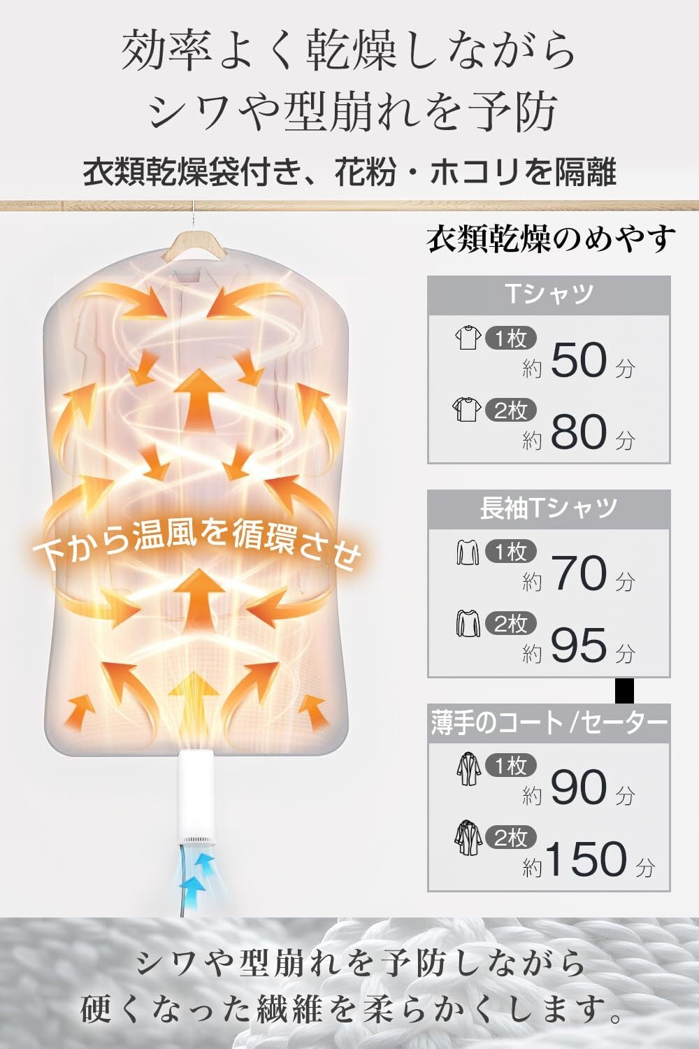 【1台3役・ふとん乾燥・衣類乾燥・靴乾燥】ホースは伸びるため、ふとんの奥までしっかりと温風を届け、冬は暖かいふとんに仕上げます。ダニ対策にも効果的です。濡れた衣類を温風で循環させながら乾燥させます。シワや型崩れを防ぎ、さらに花粉や黄砂からも守ります。ドラム式乾燥機と異なり、衣類をハンガーにかけて乾燥できるため、シワになりにくく形崩れの心配もありません。簡単にセットでき、洗った靴や雨、汗で湿った靴を手軽に乾燥させ、不快感や、気になる靴の臭いも簡単に解消します。※衣類乾燥袋付属