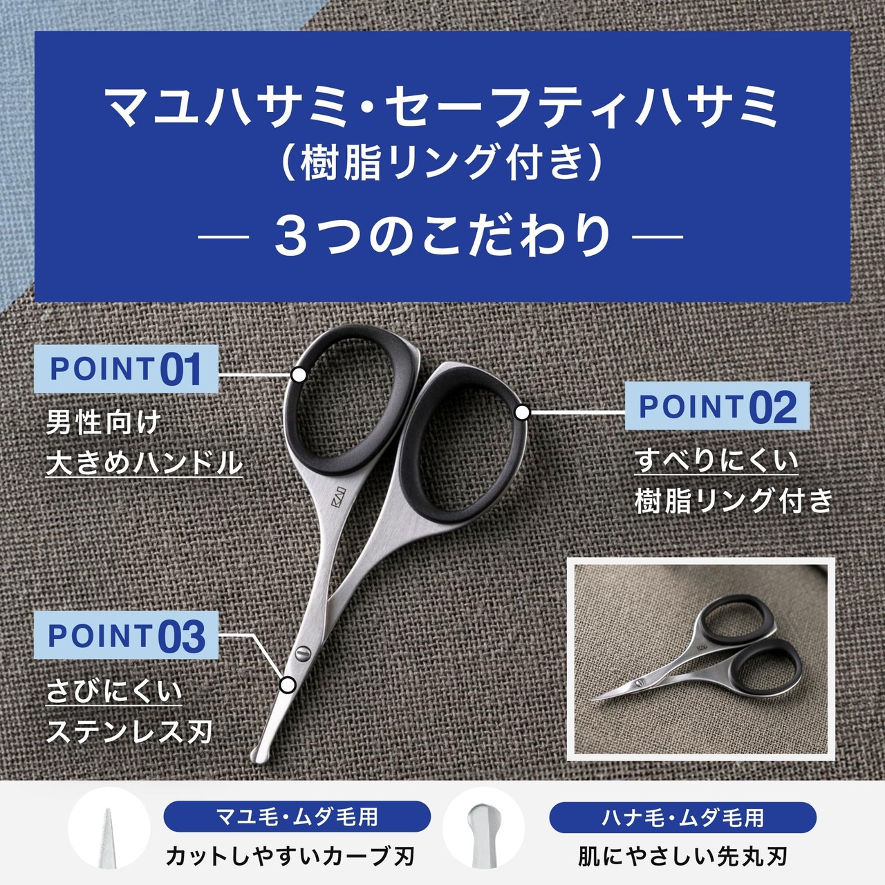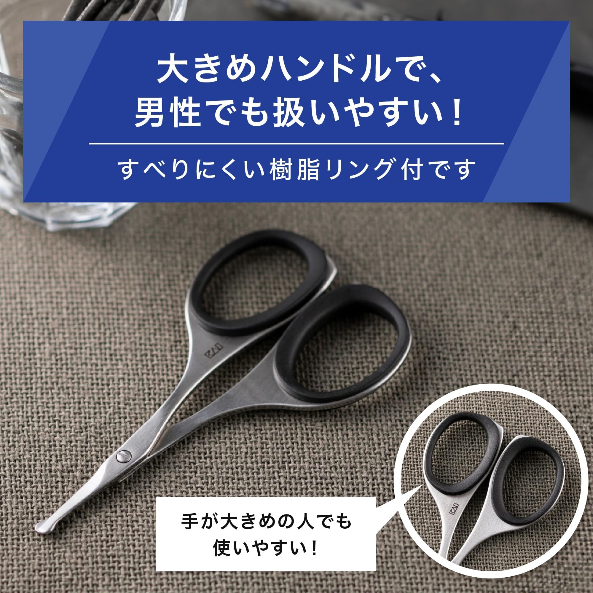 男性向けの指穴サイズで、すべりにくい樹脂リングを装着したオール金属の鼻毛用ハサミです。