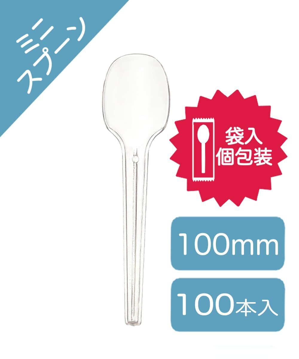 1本ずつ個包装された使い捨てミニスプーン。 長さ100mmでデザートに使いやすいサイズ。 透明クリア素材で清潔感のある見た目。 衛生管理しやすく業務用・テイクアウト向き。 100本入りでイベントや店舗利用に便利。