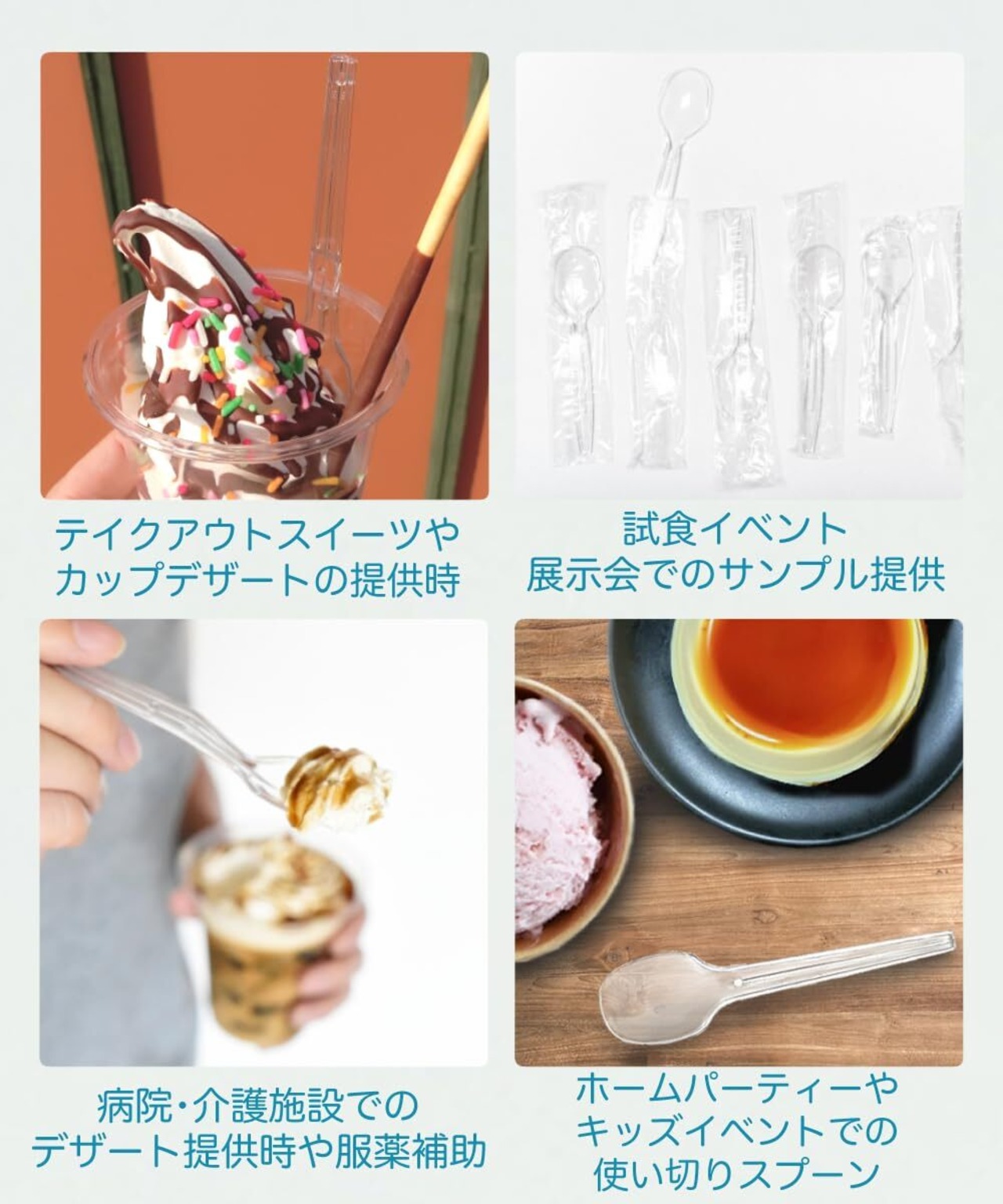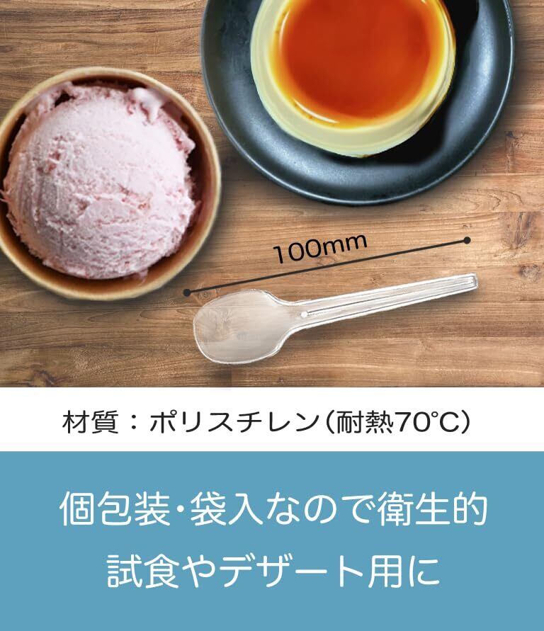 1本ずつ個包装された、使い捨てタイプのプラスチック製ミニスプーンです。 長さ100mmのコンパクトサイズで、プリン・ゼリー・ヨーグルト・アイスなどのデザートに最適。 透明感のあるクリア素材で、シンプルかつ清潔感のある印象です。 個包装のため衛生管理がしやすく、テイクアウト・イベント・業務用シーンでも安心して使用可能。 100本入りで、店舗用・まとめ使いにも便利です。【ご使用上の注意】●火気に近づけないでください。変形することがあります。●使い捨て商品です。数回にわたってのご使用はおすすめしません。●本来の目的以外のご使用はご遠慮ください。