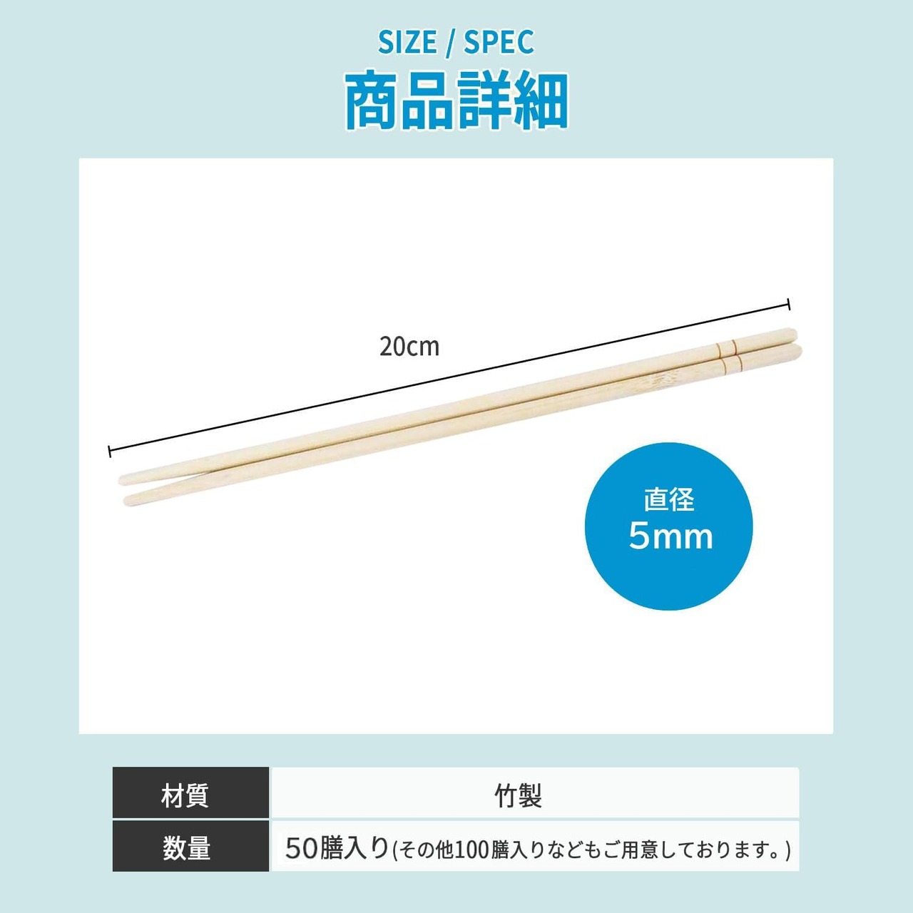 サイズ(約):長さ20cm×直径5mm、材質:竹材、入数:50膳×2個セット(楊枝なし)、生産国:中国